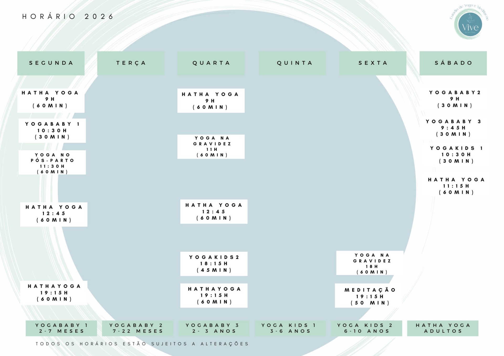 O estúdio tem à disposição dos alunos vários horários para que possam escolher de acordo com as suas rotinas e necessidades. Uma das preocupações do estúdio é que os horários de prática não sejam geradores de stress e que por isso possam de alguma forma comprometer a regularidade. Assim sendo, é possível ajustar a rotina ao horário de prática, desde que haja vaga no horário escolhido.